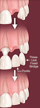 A bridge spans a space where one or more teeth have been lost in the dental arch. We replace the missing teeth with custom-designed replacement teeth, which are anchored by crowns to existing healthy tooth structure.